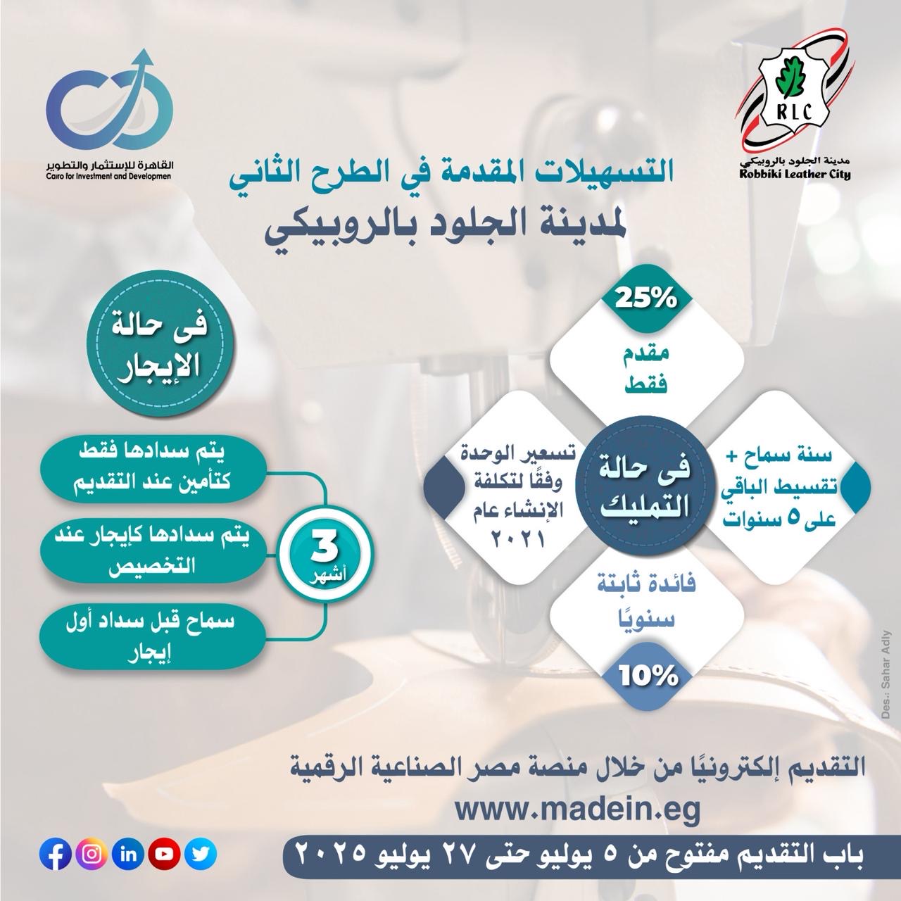وزارة الصناعة: “القاهرة للاستثمار والتطوير” تواصل تلقي طلبات المستثمرين ضمن الطرح الثاني بمدينة الجلود بالروبيكي على 36 مصنعًا جديدًا كامل التجهيزات لإنتاج المصنوعات الجلدية تامة الصنع ، ٢٧ يوليو الجاري آخر موعد لسحب الكراسات والتقديم إلكترونياً على منصة مصر الصناعية الرقمية madein.eg، والطرح بنظامي التمليك والإيجار ، حزمة متكاملة من …
