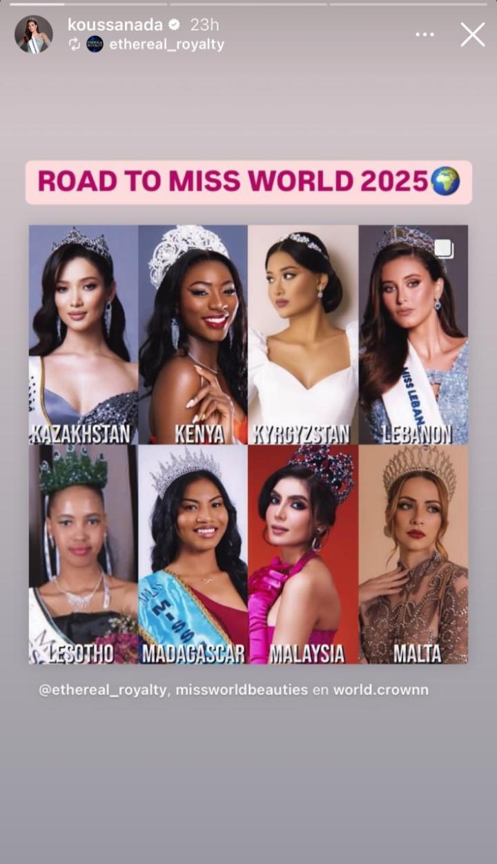 تستعد ملكة جمال لبنان لعام 2024 ندى كوسا للمشاركة في مسابقة ملكة جمال العالم وذلك بعد مشاركتها في مسابقة ملكة جمال الكون عام 2024. في التفاصيل، شاركت ندى كوسا عبر الخاصية القصصية في حسابها على انستغرام منشوراً يتضمن صوراً لمتسابقات ملكة جمال العالم وعلقت كاتبة:”الطريق الى ملكة جمال العالم”. …