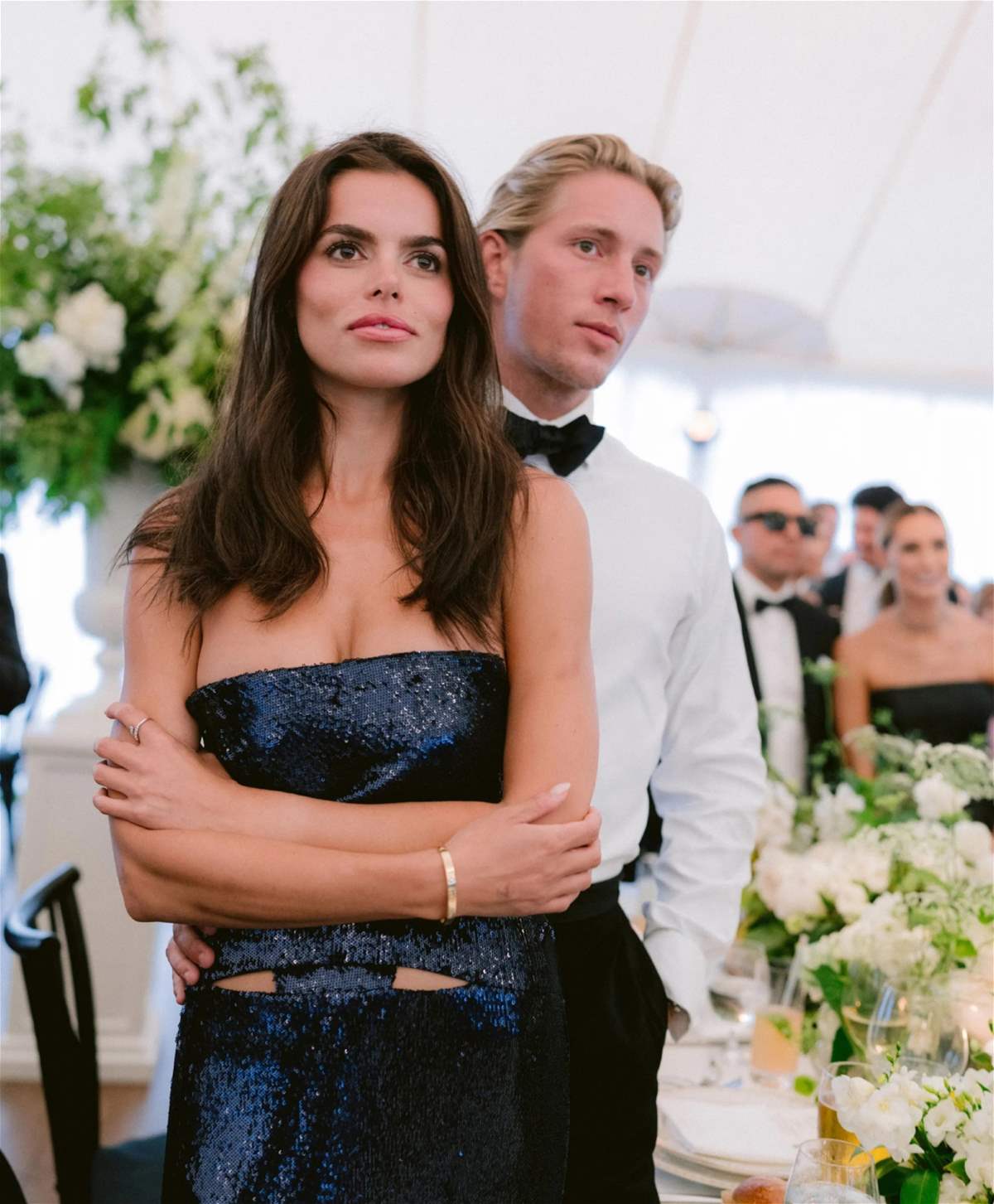 وتألقت بروكس بثوب مطرز باللون الأزرق الداكن وأكملت إطلالتها بسوار كارتييه، أما الأمير قسطنطين فقد اختار بدلة رسمية كلاسيكية.