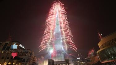 برج خليفة، أعلى مبنى في العالم، مضاء بالألعاب النارية في دبي أثناء الاحتفالات بقدوم العام الجديد.