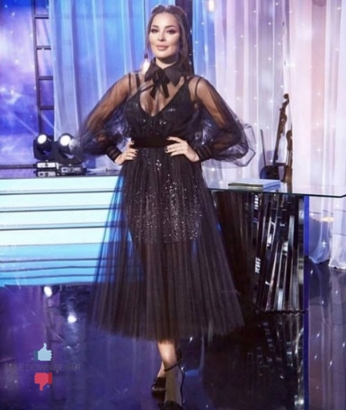 وأختارت نجيم إطلالة في غاية الرقي والعصرية من توقيع المصمم اللبناني العالمي جورج شقرا، تميز بقصة التنورة من قماش التول والشيفون الأسود.