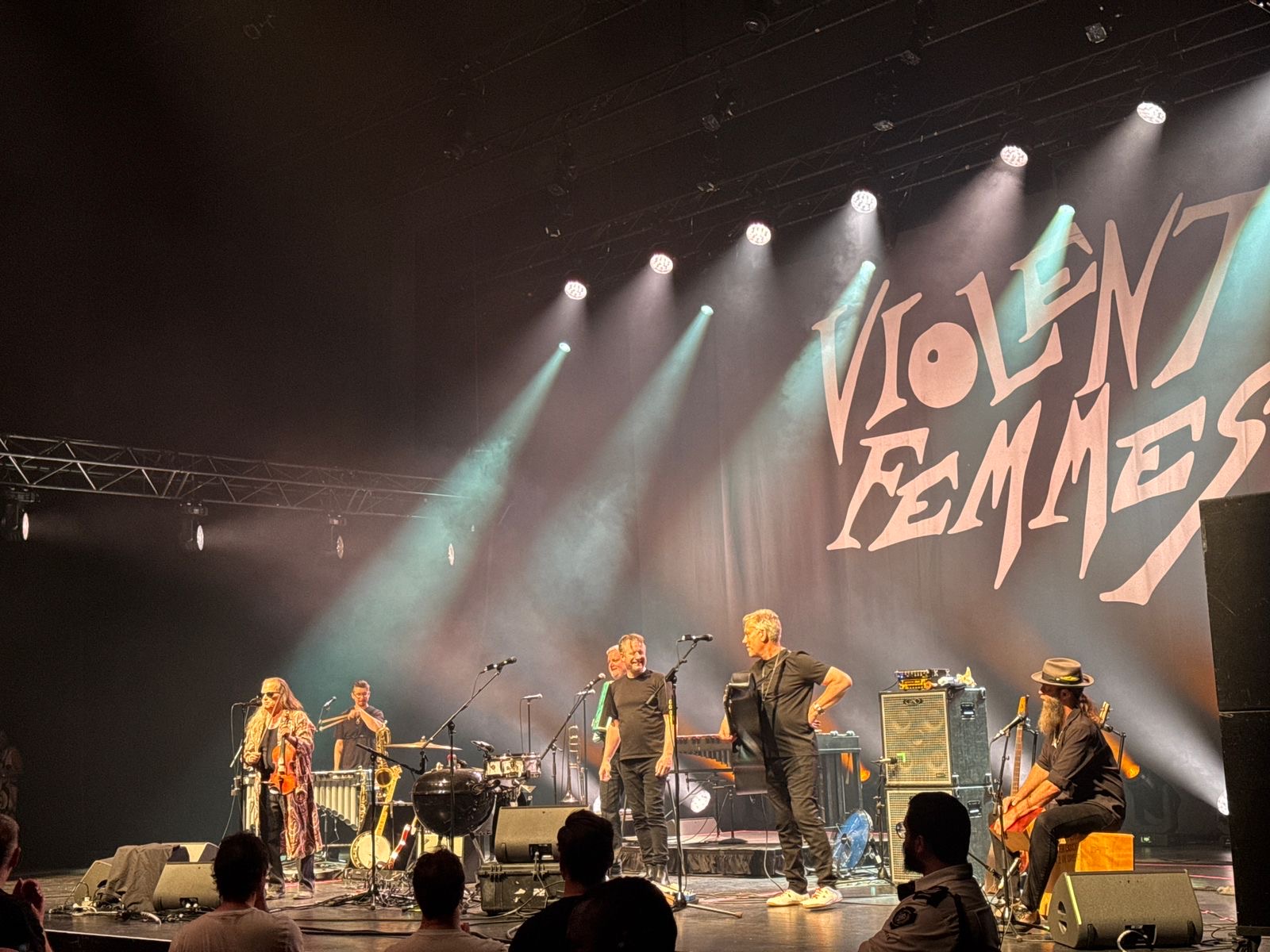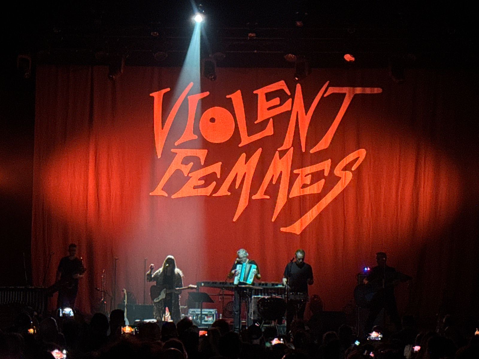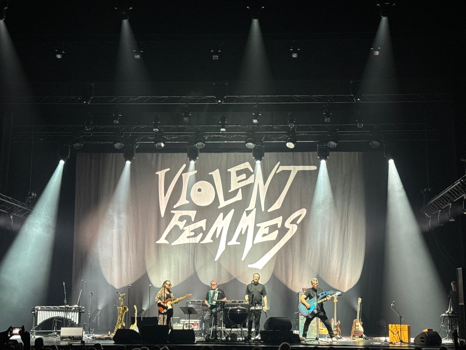 Sous un éclairage théâtral rouge et blanc, avec leur nom affiché en grand sur fond de rideaux plissés, Gordon Gano (voix et guitare) et Brian Ritchie (basse) ont captivé l’audience en enchaînant les titres cultes comme Add It Up et Kiss Off, mêlant instruments traditionnels et touches expérimentales. L’usage d’un xylophone, d’un saxophone, d’un accordéon et même d’un barbecue métallique pour les percussions a renforcé le caractère unique de la performance.