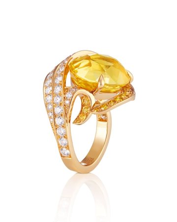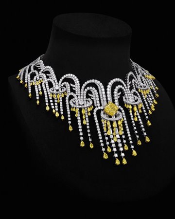 أبرز ما في المجموعة هو عقد Eaux d’Artifice، الذي يتوسّطه حجر ماسي أصفر فخم بوزن 20.25 قيراطاً، تحيط به مئة ماسة صفراء كاحتفال شعري بكل عام من تاريخ الدار، لتبدو القطعة وكأنها نافورة من الضوء المتدفق حول العنق.