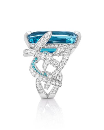 وفي مجموعة Cento، تنساب أحجار الياقوت الأزرق كقطرات ماء على الأساور والعقود، بينما تحاكي الأقراط انسيابية الرذاذ وهي تتلألأ مع الحركة. ومع سوار وخاتم Ovato، يلتقي الأكوامارين بترصيع ماس دقيق في مشهد يستدعي رقص الماء تحت الشمس.