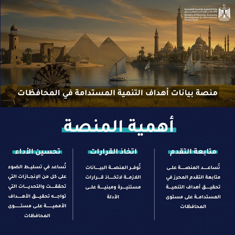 في إطار جهود الدولة المصرية لتحقيق التنمية المستدامة، وتعزيز عملية صنع القرار القائم على الأدلة والبيانات، أطلقت وزارة التخطيط والتنمية الاقتصادية والتعاون الدولي، «منصة بيانات أهداف التنمية المستدامة في المحافظات»، التي تُعد منصة رقمية تفاعلية لعرض وتحليل مؤشرات أهداف التنمية المستدامة على مستوى المحافظات، حيث تقدم نظرة عامة وشاملة عن وضع التنمية المستدامة في جميع المحافظات المصرية على مستوى الهدف الأممي، كما تعرض صورة كاملة عن وضع أهداف التنمية المستدامة على مستوى مؤشرات الأداء في كل محافظة.