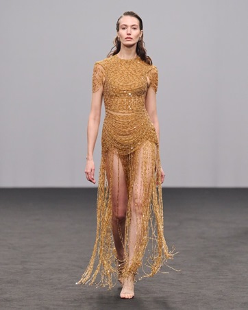 قدّمت المصممة الهندية Krésha Bajaj أول عروضها العالمية من دبي بتشكيلة عنوانها “The Archive of Hidden Things” حملت معها روح “الهوت كوتور” داخل أزياء جاهزة للارتداء. تنقسم المجموعة إلى 3 فصول: Revelation، Obsession، وLiberation . كل فصل حمل طابعاً خاصاً لكنه في النهاية كوّن رواية كاملة عن الغموض والتمكين. لوحة الألوان من الوردي الباهت إلى النحاسي المتوهج منحت التصاميم دفئاً ورفاهية، ولم تكتفِ بجماليات التصميم، بل وضعت الاستدامة في صلب عملها من خلال الإنتاج المحدود وإعادة تدوير الخامات.