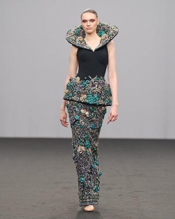 قدّمت المصممة الإماراتية “Heba Jasmi” تشكيلتها “Born to Rise” أعادت من خلالها صياغة الأنوثة بلغة معمارية أنيقة، وكأنها تبني جسوراً بين ملامح المرأة ورمزية المكان. الألوان المختارة من الذهبي إلى الأخضر الفاتح مروراً بالمرجاني الصحراوي والكحلي الليلي كانت لوحة شاعرية توازن بين الدفء والفخامة.