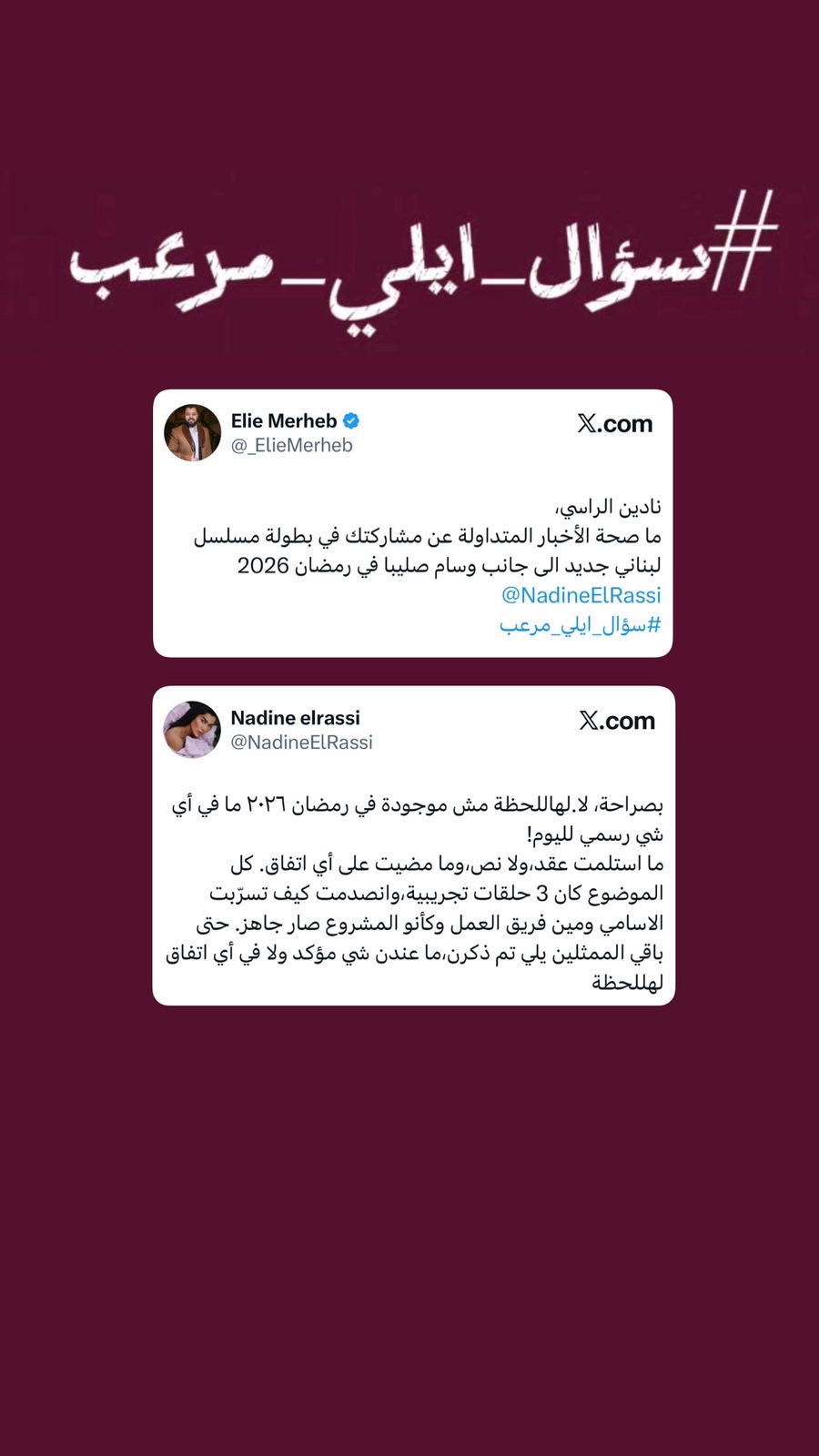 أعلنت النجمة نادين الراسي عبر مقابلة ضمن فقرة سؤال إيلي مرعب مع الصحفي إيلي مرعب، أنها لن تخوض السباق الدرامي في رمضان 2026.