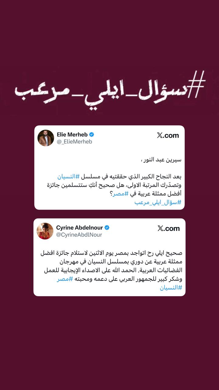 “سيرين عبد النور، بعد النجاح الكبير الذي حققتِه في مسلسل #النسيان وتصدّرك المرتبة الأولى، هل صحيح أنك ستتسلمين جائزة أفضل ممثلة عربية في #مصر؟”