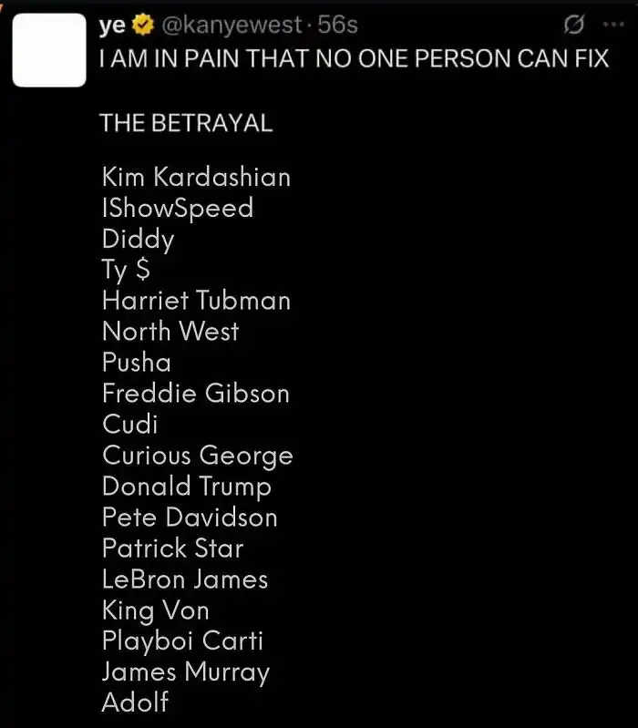 نشر كانييه ويست القائمة من خلال تدوينة عبر حسابه على منصة “إكس”، لكنه حذفها في وقت لاحق، وقال فيها: أشعر بألم لا يمكن لأي شخص إصلاحه. الخيانة.