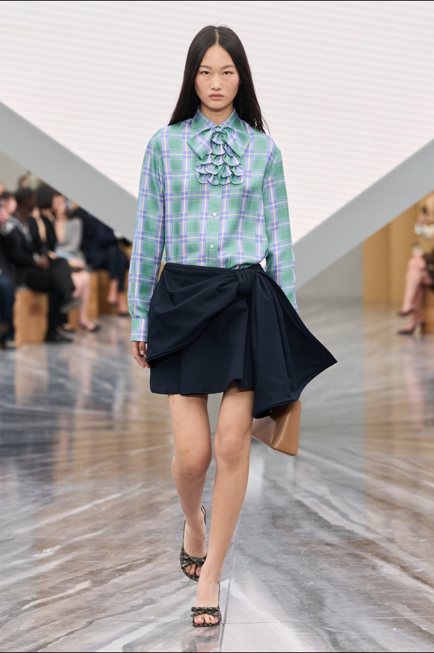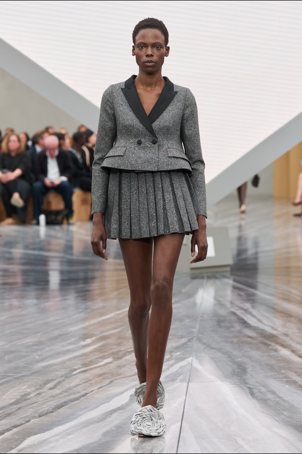 “النيو لوك” يظل المحك لكل مدير إبداعي في “ديور”. نسخة “أندرسون” جاءت بجاكيت قصير أقل هيكلة، مخيط بعناية، ظهره أعيد تشكيله بلمسة robe-à-la-française. أما التنورة الممتلئة فتحولت إلى ثنيات قصيرة أقرب إلى زي مدرسي منها إلى بيان تاريخي عن الأناقة. النتيجة: أنوثة معاصرة بروح شابة، مرحة، وحديثة بامتياز.