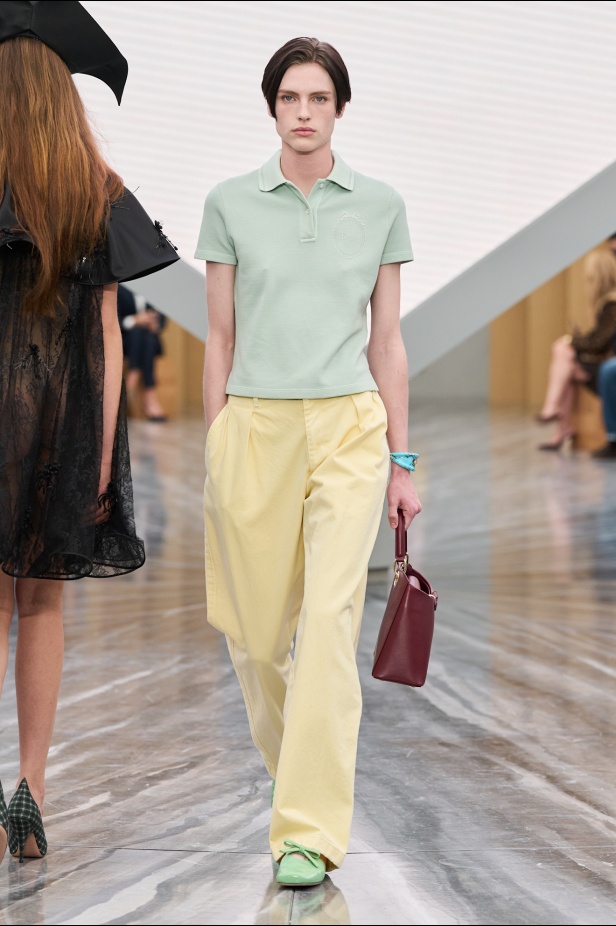 من هناك، قلب المصمم الإيرلندي الشمالي رموز الدار الباريسية، المعاطف الكلاسيكية طُويت على ذاتها، الحواشي المنتفخة وُلدت من جديد كتنانير قصيرة زهرية مرحة، أصداء الـBelle Époque تسللت إلى خلفيات و جوانب بناطيل الكارجو والمعاطف. حتى القبعة الواسعة التي توّجت يوماً صورة “النيو لوك” أعاد تشكيلها على هيئة نابليونية إيماءة إلى الثورة، والثورة جزء لا يتجزأ من ذاكرة “ديور”. الرموز كلها حضرت: الأزهار، الباستيل، الرمادي، الوردي، الأخضر… لكنها تحررت إلى أزياء جاهزة حقيقية. وعند تفكيك كل إطلالة نلمس بصمته الخاصة وقد تماهت مع هوية “ديور” الراسخة: لمسة طرافة، شيء من التجريد، والكثير من الأناقة.