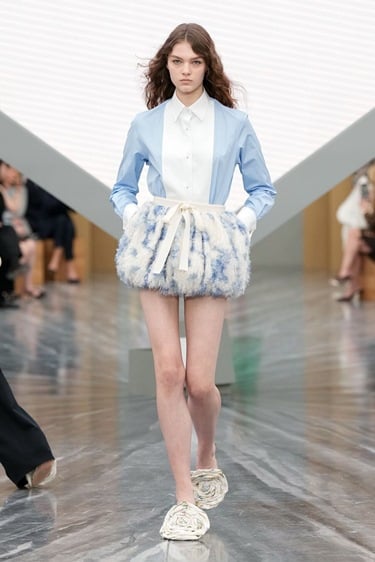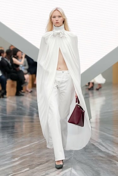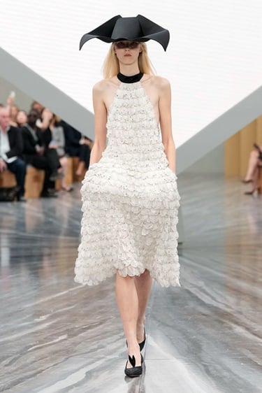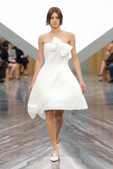 كل شيء يبدأ من الإطلالة الأولى، الانطباع الأول الذي سُيخلد في تاريخ الموضة والاختيار كان الأبيض لون البدايات والنقاء، ولوحات الرسم بفستان ينسدل متوسط الطول بصورة ظلية تحاكي الجرس دون أكمام أو أكتاف من الجيرسيه ودرابيه يحيط بالفستان مع حافة كتف وأطراف تتزين بالفيونكات في طلة رومانسية تدمج أسلوب ديور الأنثوي مع تفاصيل أندرسون ذات الطابع النحتي التجريبي.