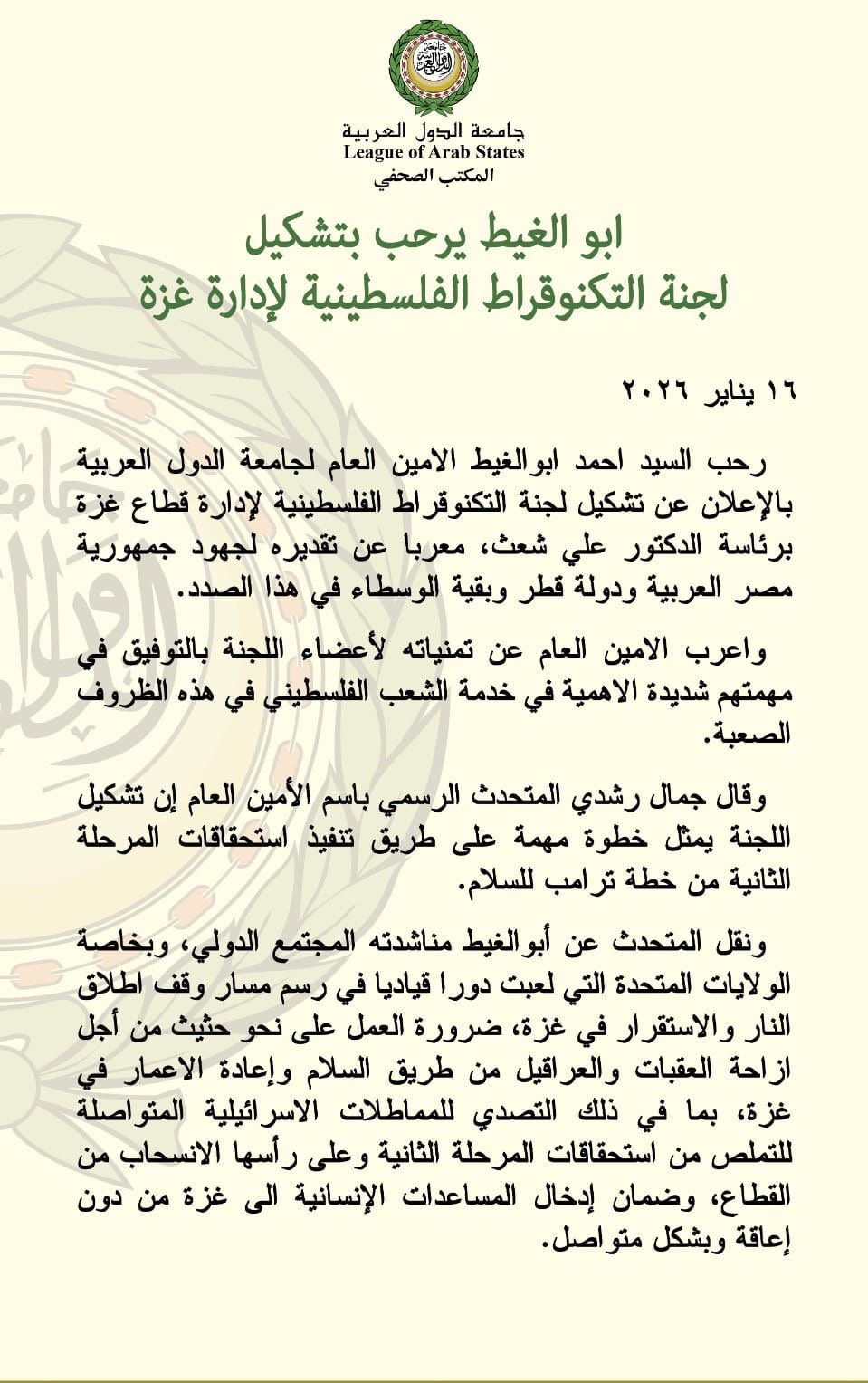 وفي 14 يناير كانون الثاني 2026 أعلنت كل من جمهورية مصر العربية ودولة قطر والجمهورية التركية اكتمال تشكيل لجنة التكنوقراط لإدارة قطاع غزة برئاسة علي شعث وعدّت الخطوة تطورا مهما لدعم الاستقرار وتحسين الأوضاع الإنسانية في القطاع.