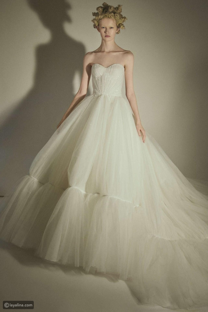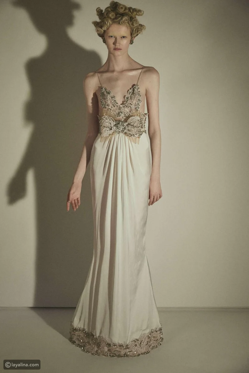 - فساتين الكرينولين المطرزة بالأحجار الكريمة والكريستال تُعيد إحياء صورة العروس الأرستقراطية، ولكن بعيدًا عن الكلاسيكية الساذجة. تظهر هذه الفساتين من خلال التول المنسدل بشفافية محسوبة، معززة بعناصر زخرفية عاكسة من الفضة والكريستال، لتخلق عمقًا بصريًا متعدد الطبقات.