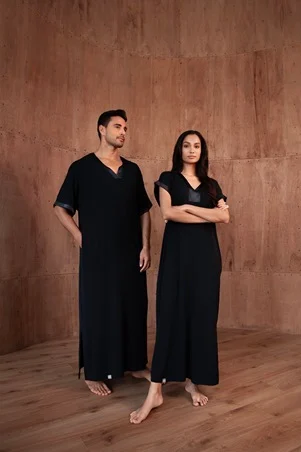 تضم التشكيلة عبايات منزلية للنساء والرجال، بأربعة ألوان مخصصة للنساء وثلاثة للرجال. لوحة الألوان هادئة ومألوفة، تتدرج بين الأسود، الأزرق الليلي، البيج الرملي، الوردي الزهري، والرمادي الداكن. التناغم بين ألوان تصاميم الرجال والنساء يمنح المجموعة انسجاماً بصرياً يعكس ذوقاً متوازناً وبسيطاً.