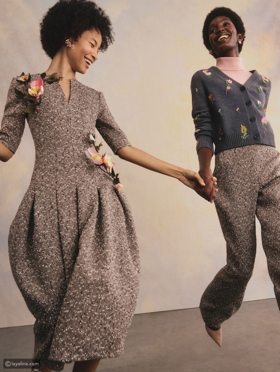 - لطالما كانت الزخارف الزهرية جزءًا أساسيًا من الهوية البصرية لدار Oscar de la Renta، وفي هذه المجموعة ظهرت الأزهار بأشكال وأحجام ومواد متعددة. فقد برزت زهور التوليب والخشخاش والهيدرانجيا في تطريزات دقيقة على سترات الكارديجان المحبوكة وفساتين النهار الصوفية المخططة، حيث أضافت لمسة من الرقة والأنوثة إلى تصاميم النهار الكلاسيكية.