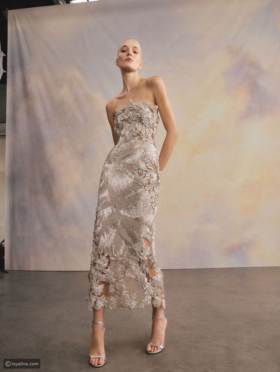 - كان من أبرز القطع فستان مصنوع من قماش الفيل كوبيه بياقة هالتر مزين بنقشة الفاوانيا، مع تنورة واسعة مكشكشة تمنحه حضورًا نحتياً لافتًا. جمع هذا التصميم بين الزخرفة النباتية والحجم الدرامي، ليقدم مثالًا واضحًا على فلسفة المجموعة القائمة على الثراء الملموس.